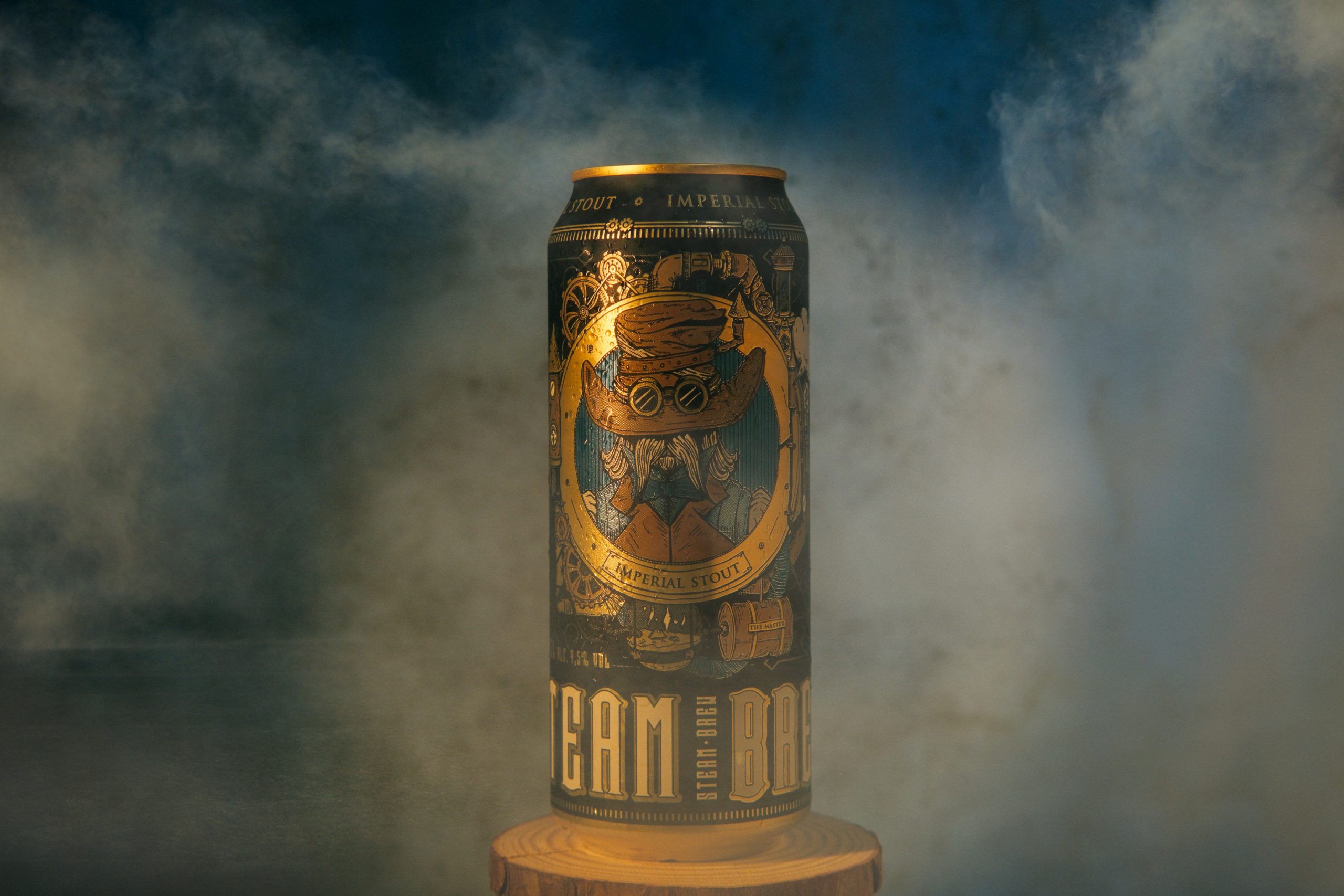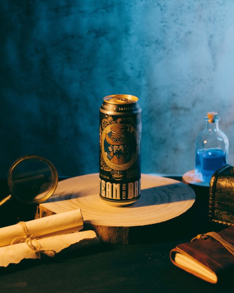 Uno de los proyectos más emocionantes que hemos realizado fue para Steam Brew, una cervecera alemana conocida por sus diseños de empaque inspirados en el estilo industrial y steampunk.