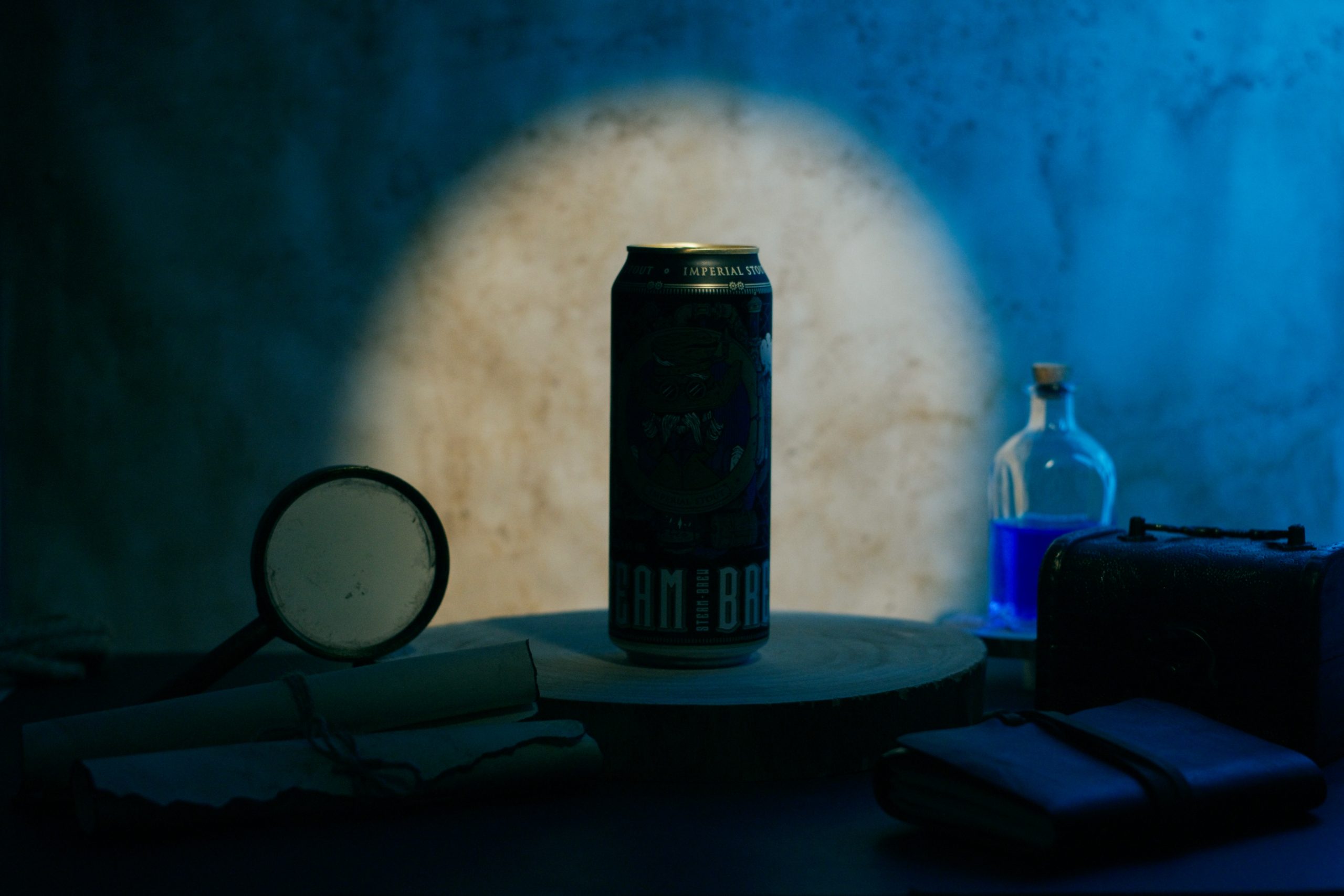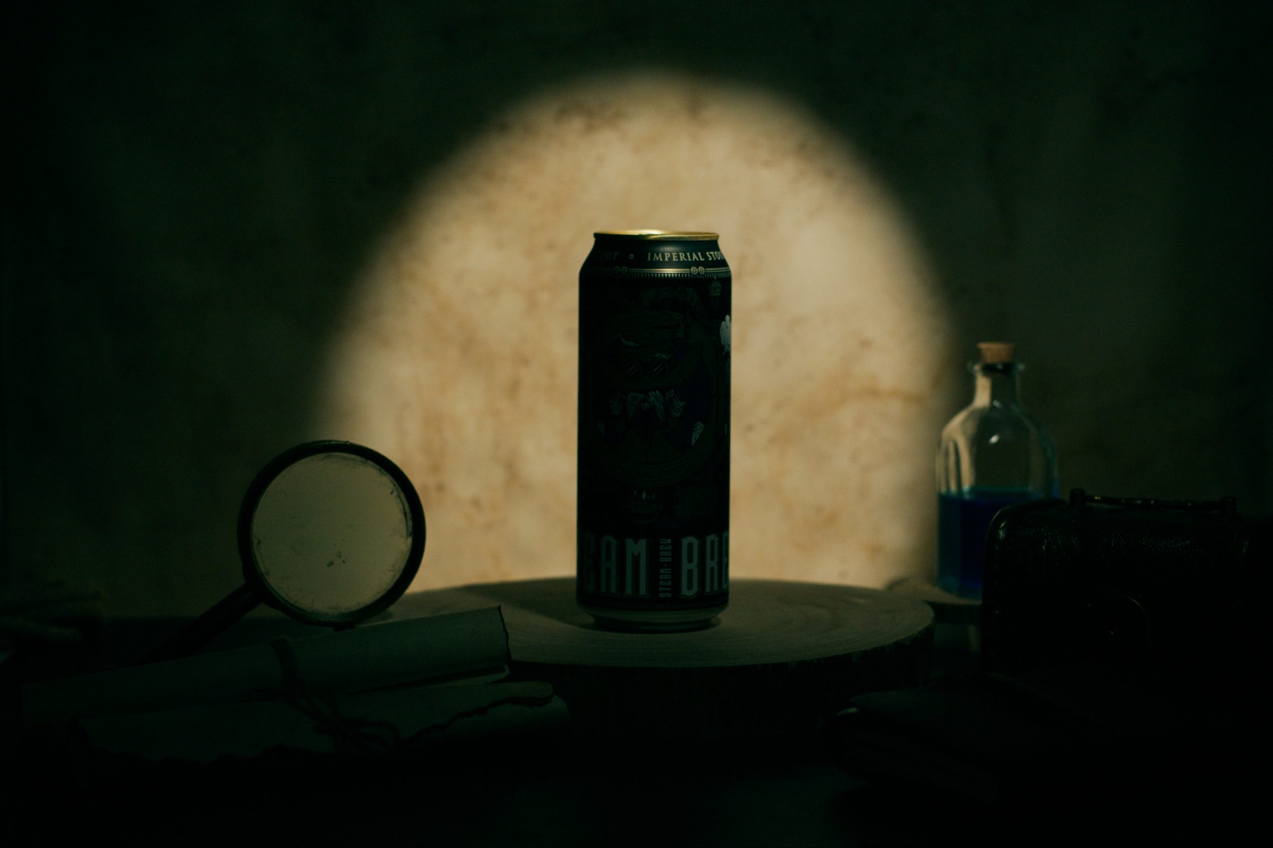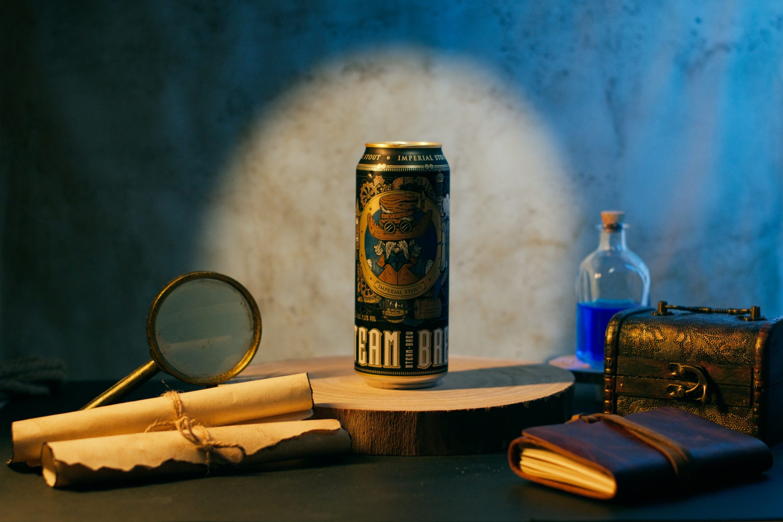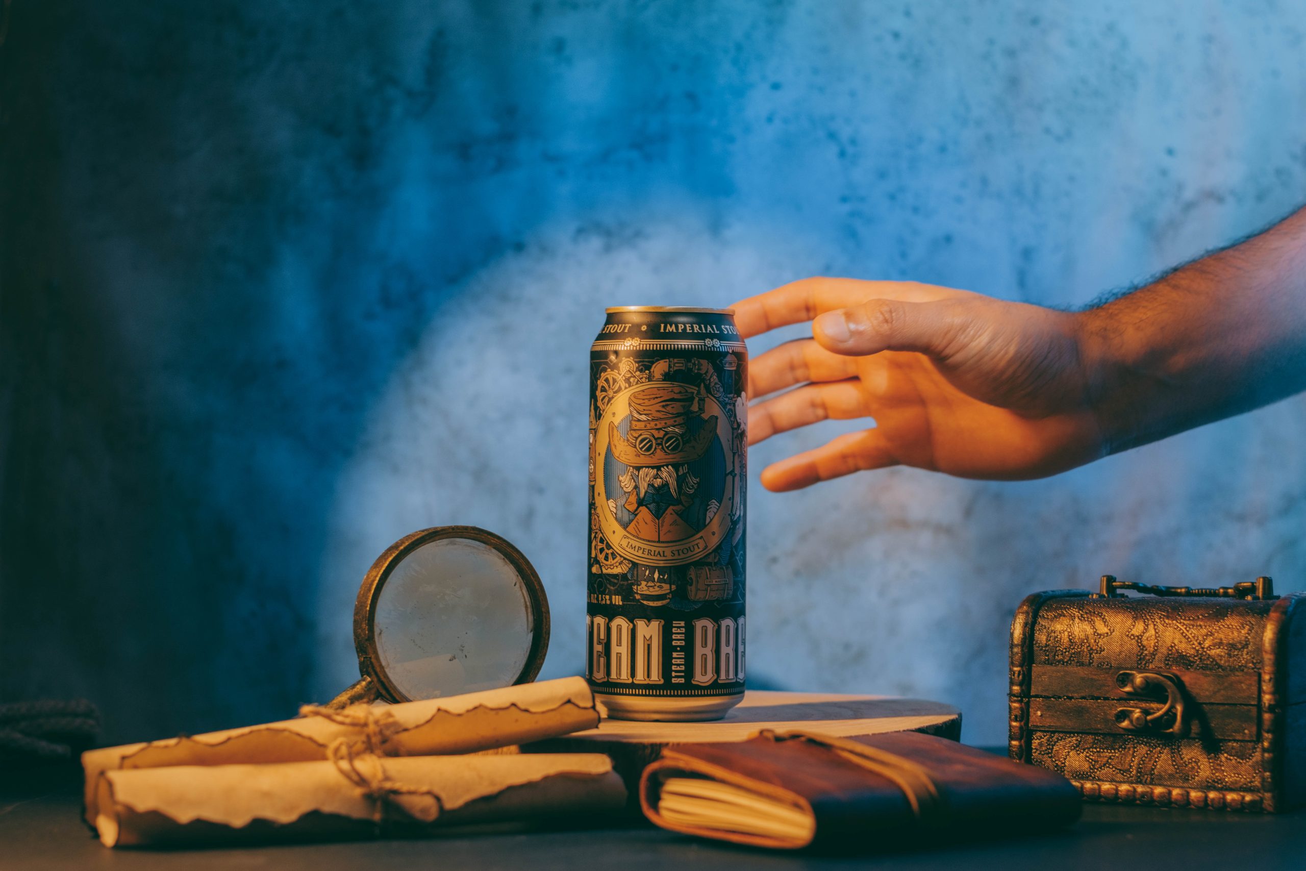 Uno de los aspectos más interesantes de esta producción fue la creación del set. Diseñamos y texturizamos los fondos fotográficos utilizando café, lo que les dio un aspecto envejecido y auténtico. Además, seleccionamos y pintamos a mano varios elementos decorativos, como lupas, pociones y pergaminos, que aportaron un aire místico y antiguo al set. La combinación de estos elementos permitió crear un ambiente ideal para destacar la Imperial Stout, una cerveza robusta y oscura que encaja perfectamente con la estética industrial y misteriosa del steampunk.